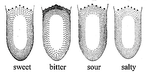 Hänig (1901) ábrája. A pontok sűrűsége a nyelv különböző területein az egyes ízek (édes, keserű, savanyú, sós) érzékelésének relatív intenzitását mutatja, függetlenül más ízek intenzitásától, ami miatt a négy kép valójában nem összevethető.