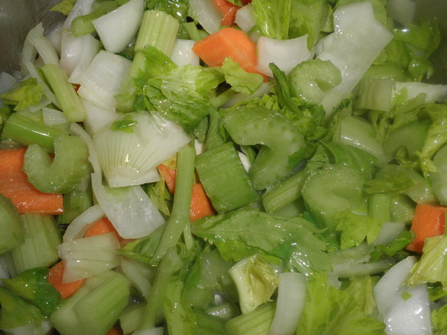 - Vágjunk fel 2:1:1 arányú megtisztított hagymát, sárgarépát, szárzellert.