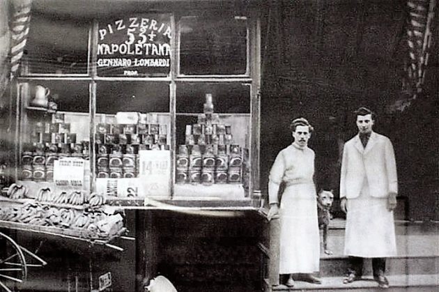Amerika első pizzériájának tulajdonosa, Gennaro Lombardi, 1905-ben, a Pizzeria Napoletana előtt,