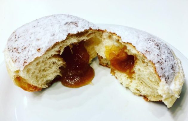 Zsírban sütött, baracklekvárral töltött, porcukorral megszórt, módos kelt fánk