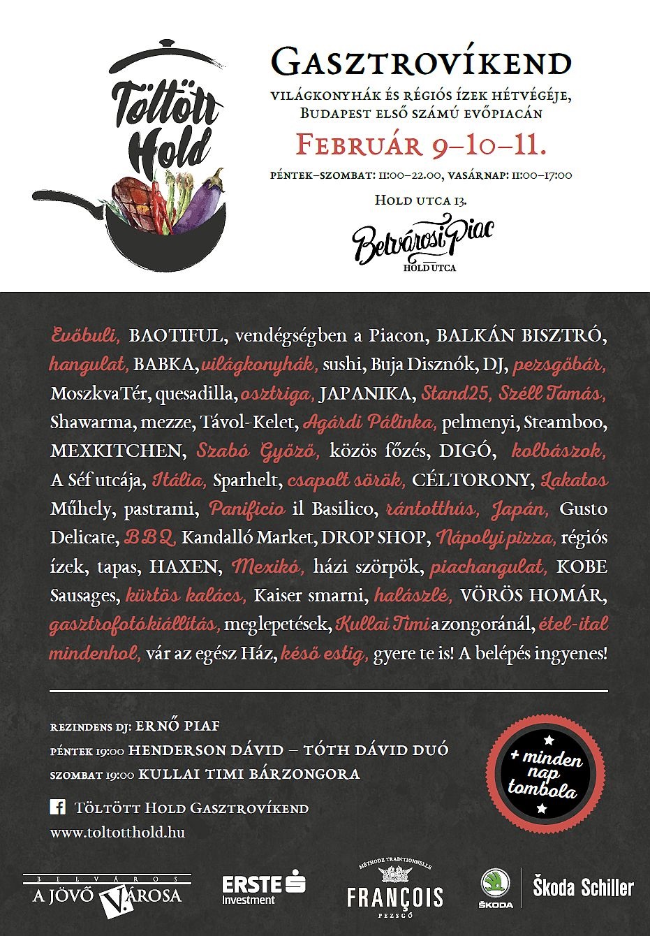 Az biztos, hogy a tél legkülönlegesebb gasztro-eseménye mindenkinek tartogat kedvére valót, a klasszikus ízektől a világkonyhák népszerű fogásain át az igazi piackonyhákig. Érdemes felkeresni a Hold utcai vásárcsarnok épületét a farsang zárásaként, hiszen családi programnak és ínyenckedésnek is kiváló alkalom a Töltött Hold Gasztrovíkend.