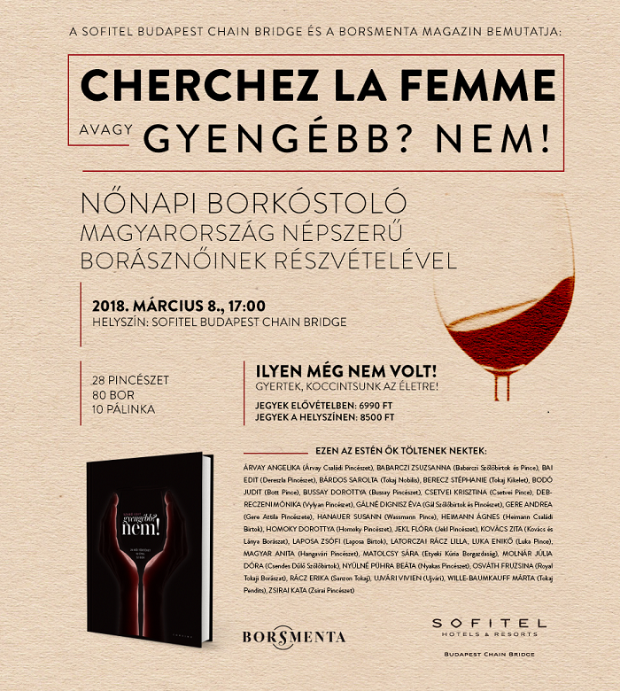 megjelenése után elhatároztam, hogy szervezek egy olyan kóstolót, ahol csak borásznők mutatják be boraikat, hátha akkor a szebbik nem képviselői is nekibátorodnak, és akár a barátnőikkel akár a párjukkal együtt ellátogatnak a rendezvényre. A terv megtetszett a Sofitel Budapest Chain Bridge-nek, így együtt hozzuk létre az eseményt. Nagyon izgulunk, mert ilyen még tényleg nem volt, a programba a könyvben nem szereplő borásznők közül is bekapcsolódnak néhányan, és kínálunk pálinkát is, természetesen – női kézből. Rendhagyó borkóstolónkat március 8-án tartjuk, és meggyőződésünk, hogy ez végre tényleg egy kihagyhatatlan nőnapi program.”