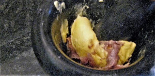 Gentleman’s Relish készítése mozsárban (használhatunk botmixert is). Készen is kapható.