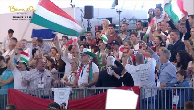 A magyar szurkolók. Balról a zászlótartó mellett, Csapody Balázs (Kistücsök, Balatonszemes), aki eddig is mindig vezérszurkolója volt a magyar csapatoknak. Ezúttal az ő emberei versenyeznek Európa legjobbjaival. (Fotó: Magyar Bocuse d’Or Akadémia, facebook)