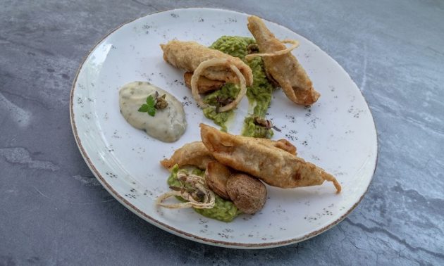 A kecskesajtos salátába popcorn kerül, a harcsa köreteként készülő hagymalekvár rooibos-teában főtt. A halleves (ezt kóstoltam és tetszett) tárkonyos és paradicsomos, a reszelt, majd tahinivel ízesített sajt pedig végül összesütve érkezik.