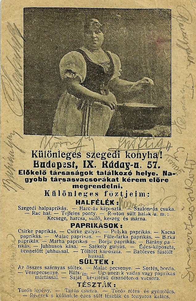 Szinte egészen hasonlóan szerénykedő szegedi főzőasszonyra bukkantam az író Tömörkény írásaiban több helyütt is – így találtam minden magyar főzőasszonyok leghíresebbikére. El is olvastam róla, amit csak lehetett. Fehér Béla barátom remek portré-sorozatát, de megtaláltam Szántó András blogján is, meg egy sereg elfelejtett visszaemlékezésben, leginkább régi szegedi lapokban. Halálakor az Újság 1922-es évfolyama a szegedi főzőasszonyt a „főzőkanál igazi költőjének” nevezte.
