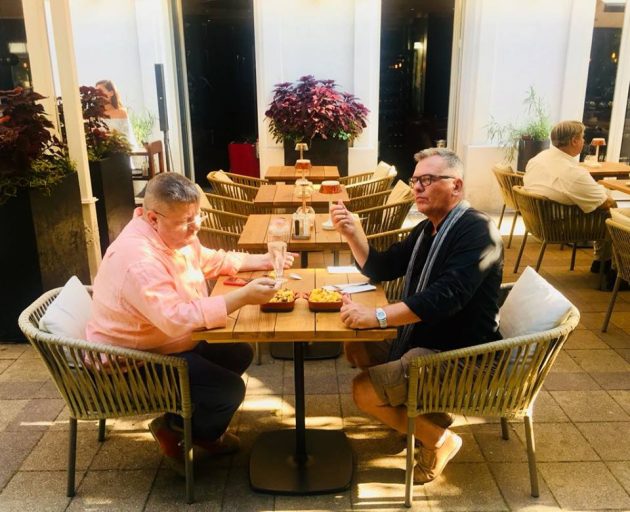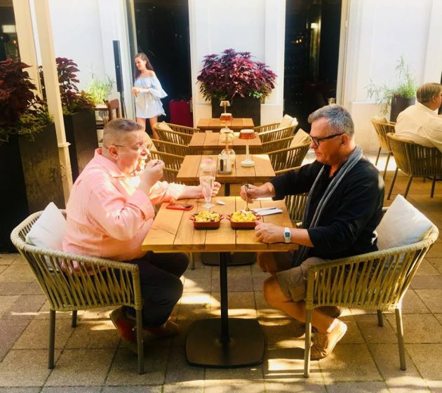 Harmath Csaba és Csíki Sándor az Enjoy étterem teraszán, Mac and Cheese ízlelgetése közben