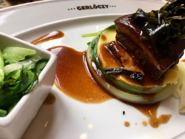 Su Dongpo vajpuha császárszalonnája, burgonyapürével, wakame-val