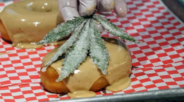 Fánk, CBD infúziós mázzal, kandírozott marihuána levéllel.