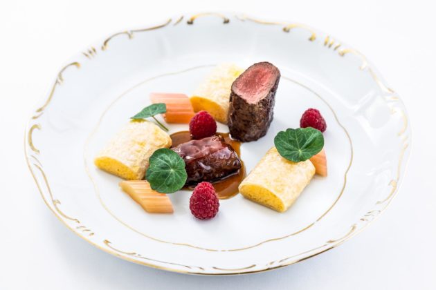 Rózsaszínűre sütött őzfilé, konfitált vaddisznó pofa, főtt grízes rétes, rebarbara (Litauszki Zsolt)