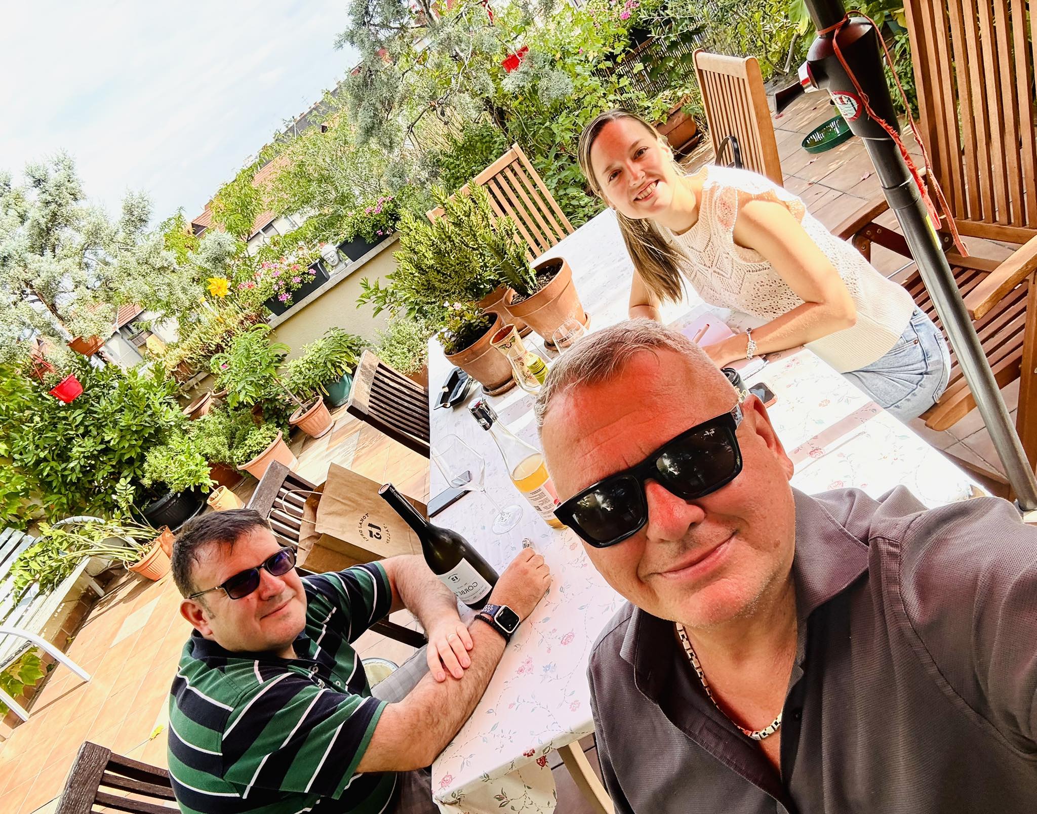 Dániel Dóra, Homolya Dániel és Csíki Sándor a Haller-teraszon TokajDrei borokat kóstol.