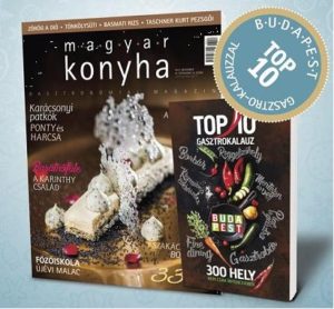 BUDAPESTI GASZTROKALAUZ – A Magyar Konyha magazin karácsonyi számához minden olvasónk ajándékba kap egy fantasztikus kötetet – írja a Magyar Konyha, majd így folytatja: „A Top 10 Budapest gasztrokalauz idén már 300 címmel jelentkezik. A kiadványban 30 X Top 10 helyet ajánlunk, amelyből 130 új felfedezés. Tesztelőcsapatunk három hónapon át látogatta Budapest gasztrobárjait, gourmet éttermeit, kifőzdéit, reggelizőhelyeit, újhullámos