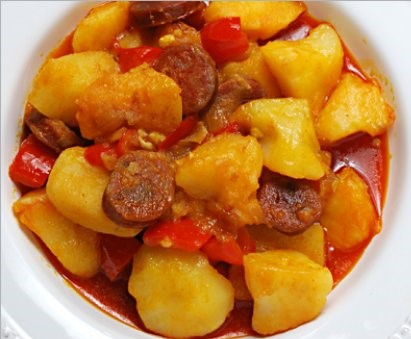 spanyol paprikás krumpliPAPRIKÁS KRUMPLI – A szegény ember közismerten vízzel főz, kivéve persze, ha vörösboros vidéken él. A Rioja vidékéről származó spanyol vörösboros paprikás krumpli (Patatas a la riojana) jó példája ennek. Az is közismert, hogy a spanyol kertészek voltak az elsők, akik megismerkedhettek az újvilág új növényeivel, így a paprikával és a burgonyával is.